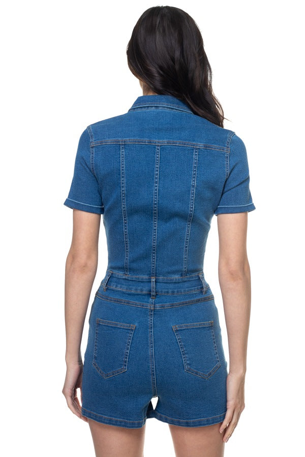 A woven denim romper, a basic collar, short sleeves with rolled cuffs, front chest flap pockets, button down trim tab, princess seams, a cinched waistline, belt loops, a front zip fly construction, a four pocket construction, and a cropped hem.