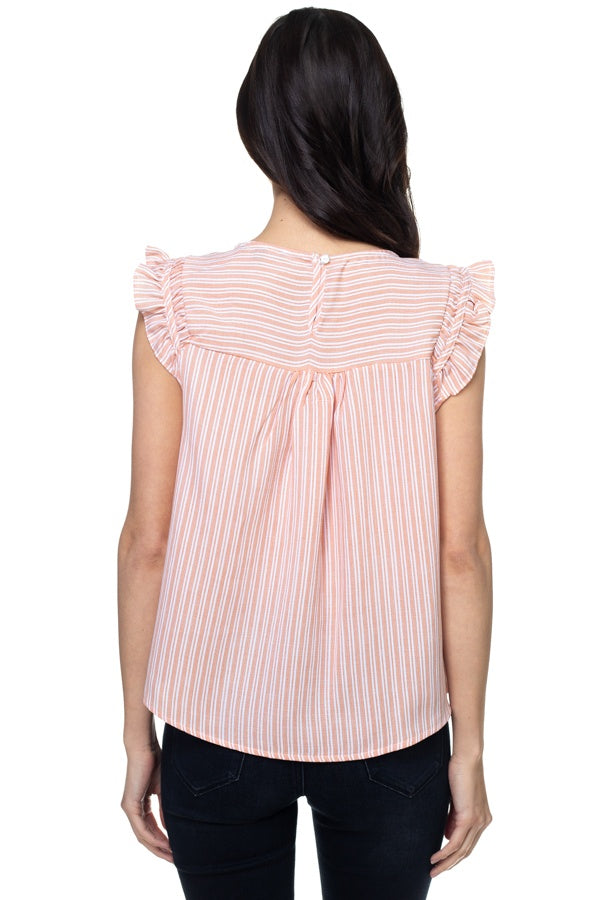 A woven top, featuring an allover stripe pattern design, a high round neckline, short ruffle sleeves,