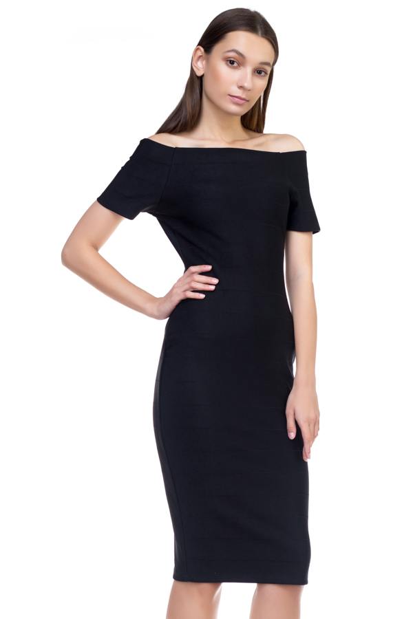 A knit midi dress, solid color, off the shoulder neckline that falls into short sleeves, featuring an allover bandage material design, a back exposed zipper, a back slit, and a midi length.