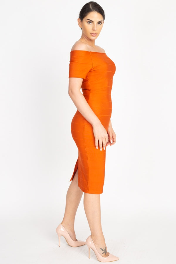 A knit midi dress, solid color, off the shoulder neckline that falls into short sleeves, featuring an allover bandage material design, a back exposed zipper, a back slit, and a midi length.