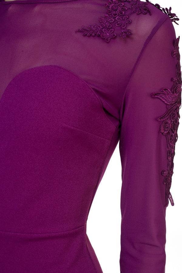 A knit mesh dress, solid color, a round neckline, long sleeves, a detail floral embroidered design through, front princess seams, a bodycon silhouette, and a mini length.