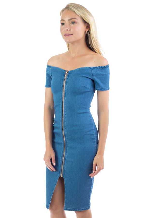 Off Shoulder Zip-front Denim Dress