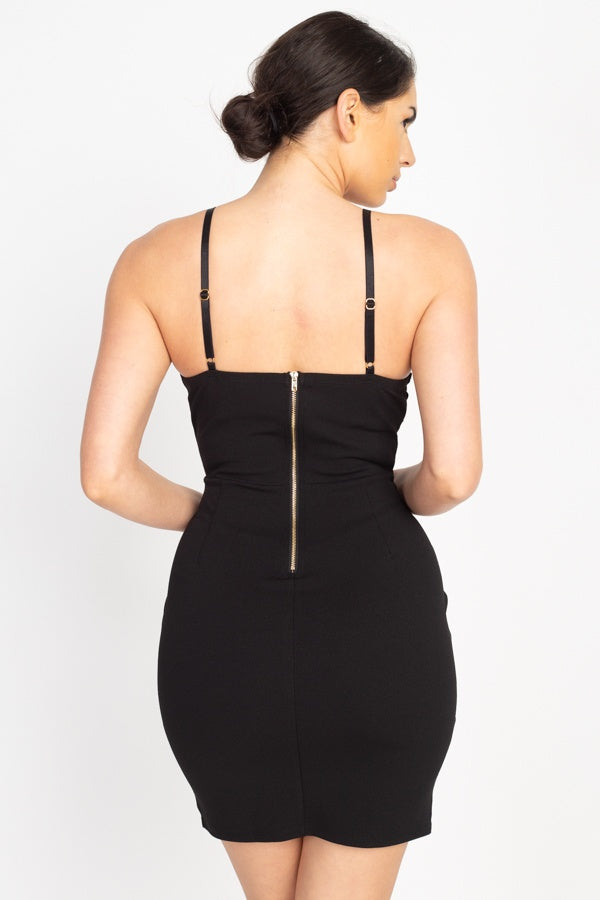 A knit mini dress featuring a surplice neckline, adjustable cami straps, floral lace embroidered design, an exposed back zip closure, and a bodycon silhouette.