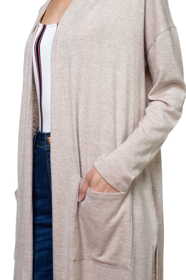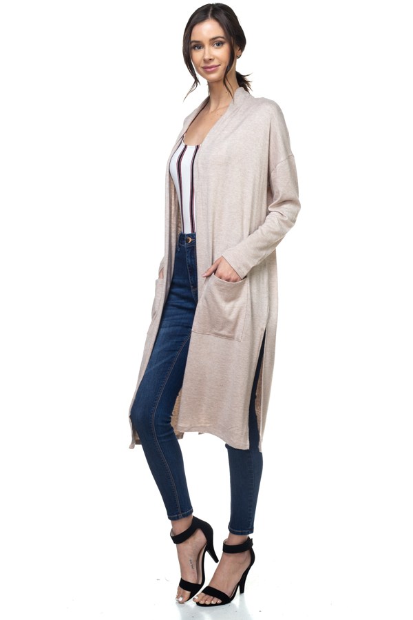 A knit cardigan, solid color, featuring an open front, dropped shoulders, long sleeves, front slip in pockets, side slits, and an over the knee length.