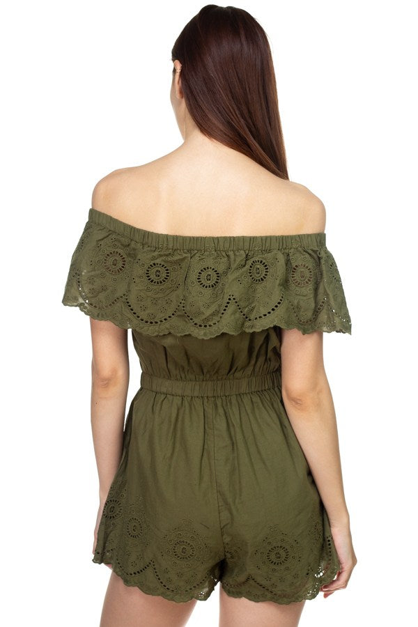 A woven romper, solid color, featuring an elasticized off the shoulder neckline that falls into a flounce layer with a floral embroidered design, pleated through, a self-tie waistline, and a scalloped cropped hem
