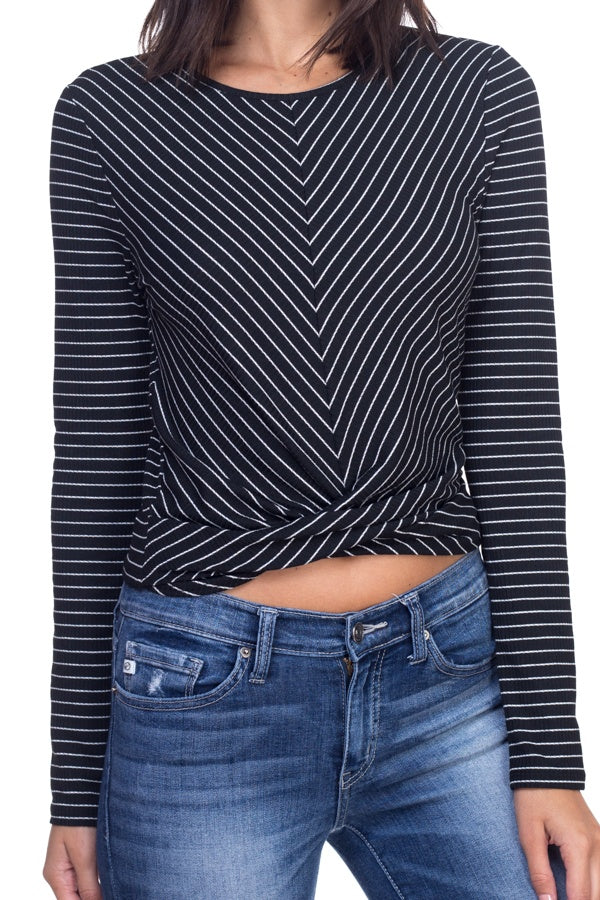 A knit textured shirt, an allover striped pattern design, round neckline, long sleeves, featuring a front twist