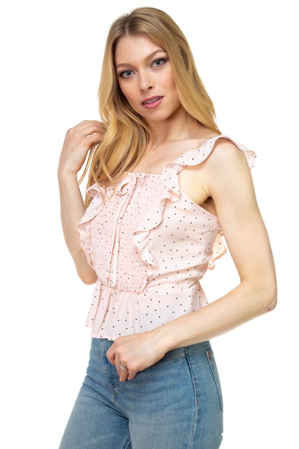 A woven top, featuring an allover polka dot print design, a squared neckline, elastic ruffle straps,