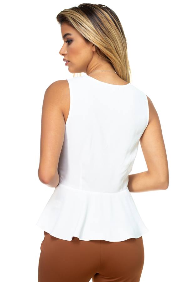 A woven top, solid color, v-neckline, a sleeveless cut, front detail pleats, a front wrap design that falls into a ruffle layer, side concealed zipper, and a ruffle high low hem.