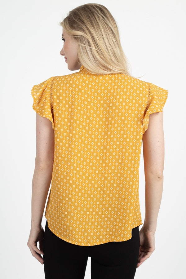 A woven top featuring an allover geo print design, ruffled short sleeves, a ruffle mock neckline, a front keyhole with a button loop closure, waist length, and cutout embroidered along the shoulders and sleeves.