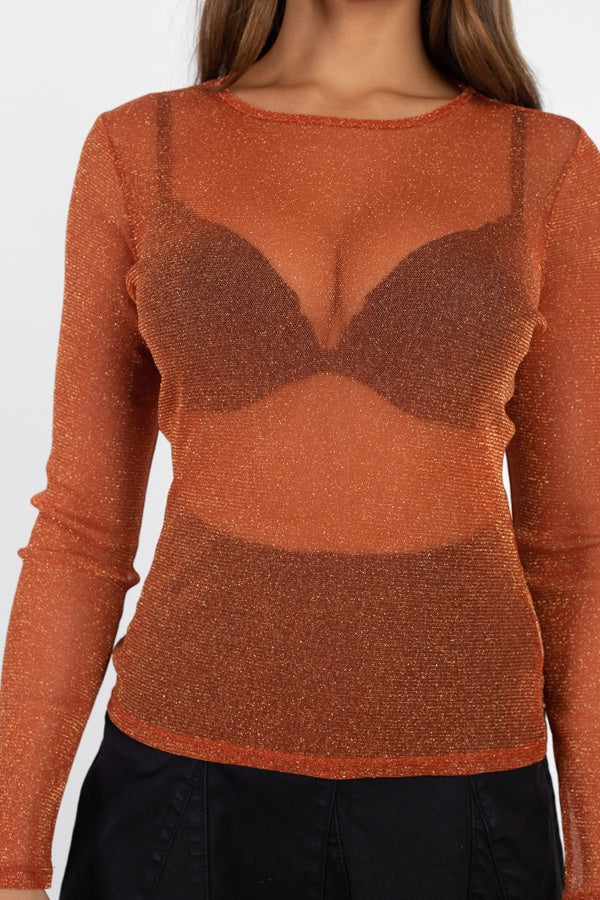A sheer mesh knit top featuring a round neckline, long sleeves, metallic threading, and a waist length.