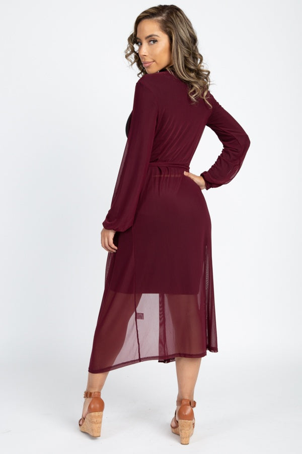 A sheer mesh knit longline cardigan featuring an open front, long sleeves with elasticized cuffs, attached self-tie sash, and a flowy silhouette
