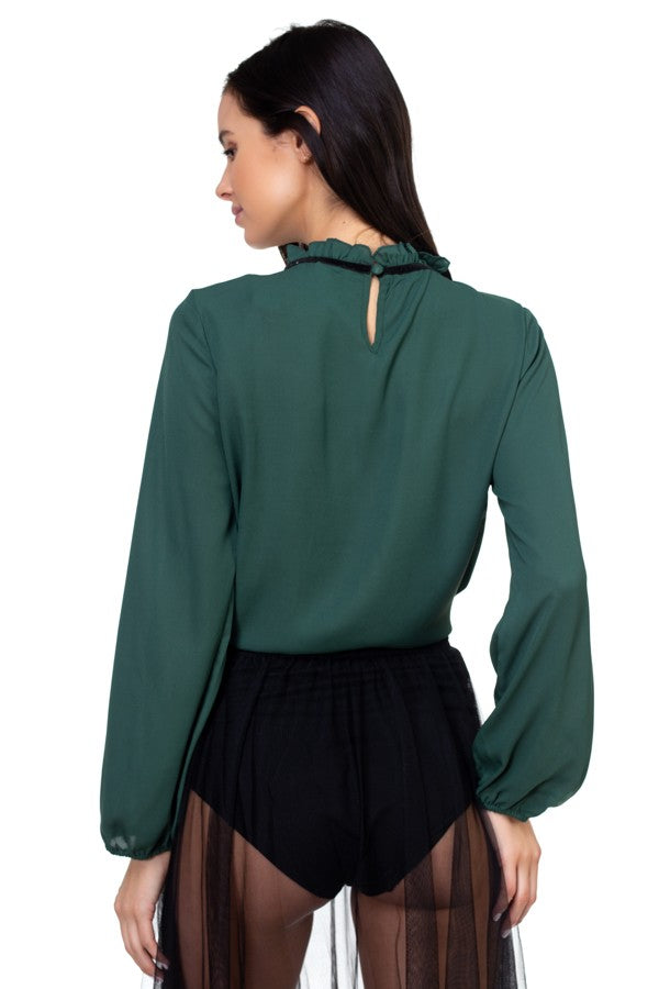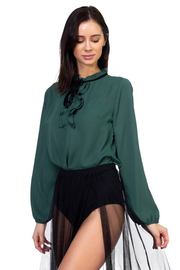 A woven shirt, solid color, a ruffle mock neckline with self-tie pussycat bow, a ruffle front design with small button detail ,