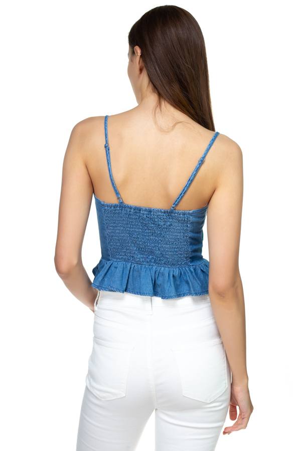 A woven top, featuring an allover denim wash design, a sweetheart neckline, adjustable spaghetti straps, front button down, princess seams, a smocked back panel, and a ruffle cropped hem.