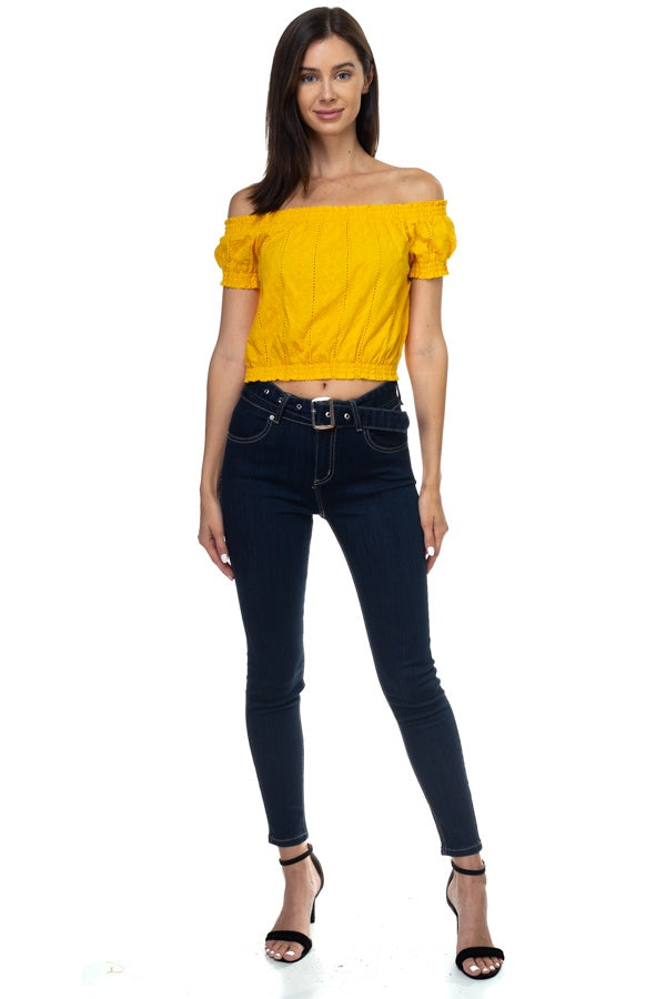 A woven top, solid color, featuring an embroidered detail design, small cutouts through, an off the shoulder neckline