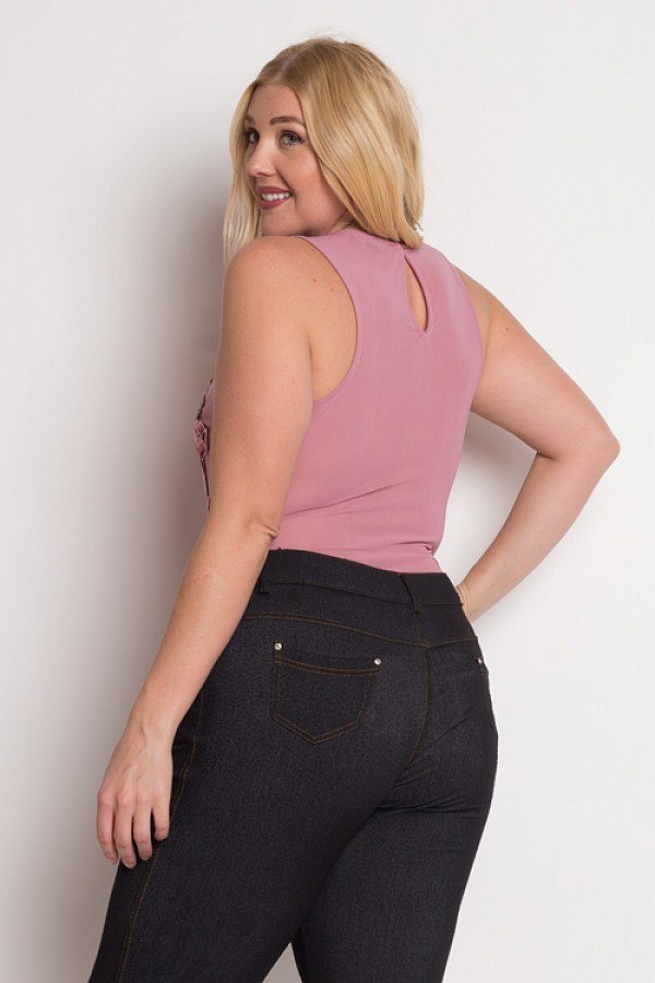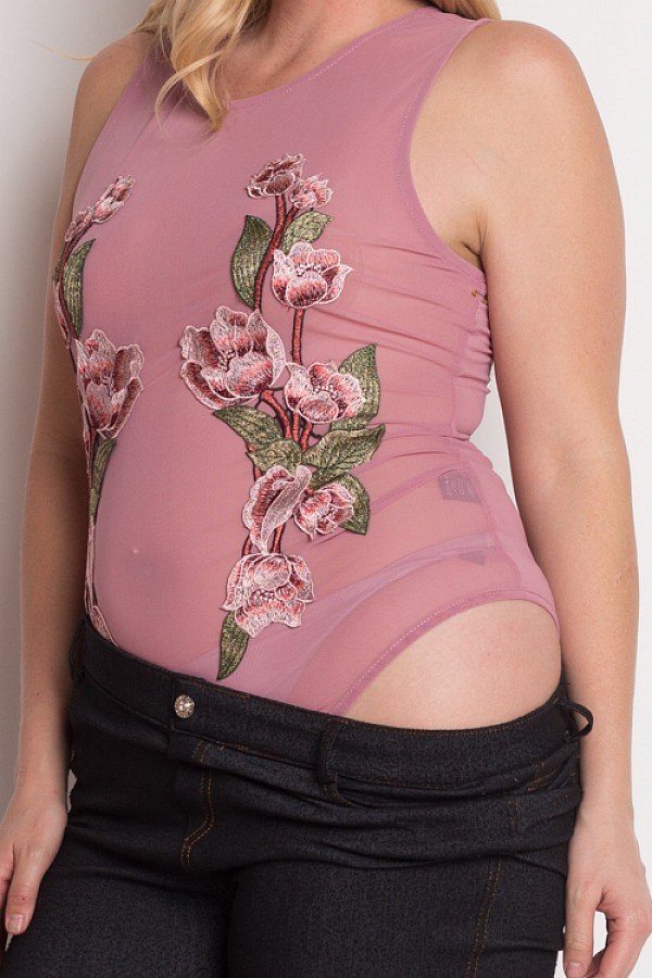 A knit bodysuit, floral embroidery, a round neckline, sleeveless, with a keyhole button in back.