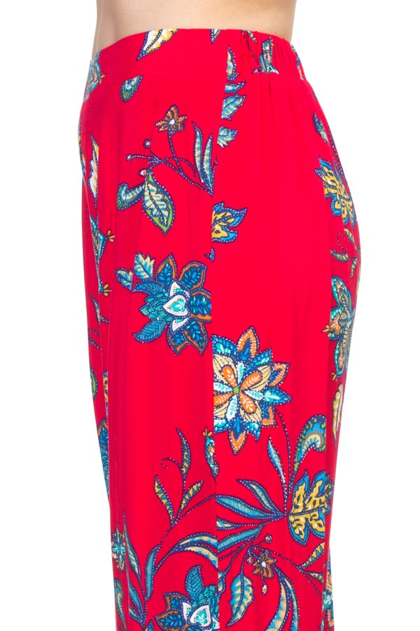 A woven pair of palazzo pants, featuring an allover floral paisley print, and elasticized back, full length, and a wide leg.