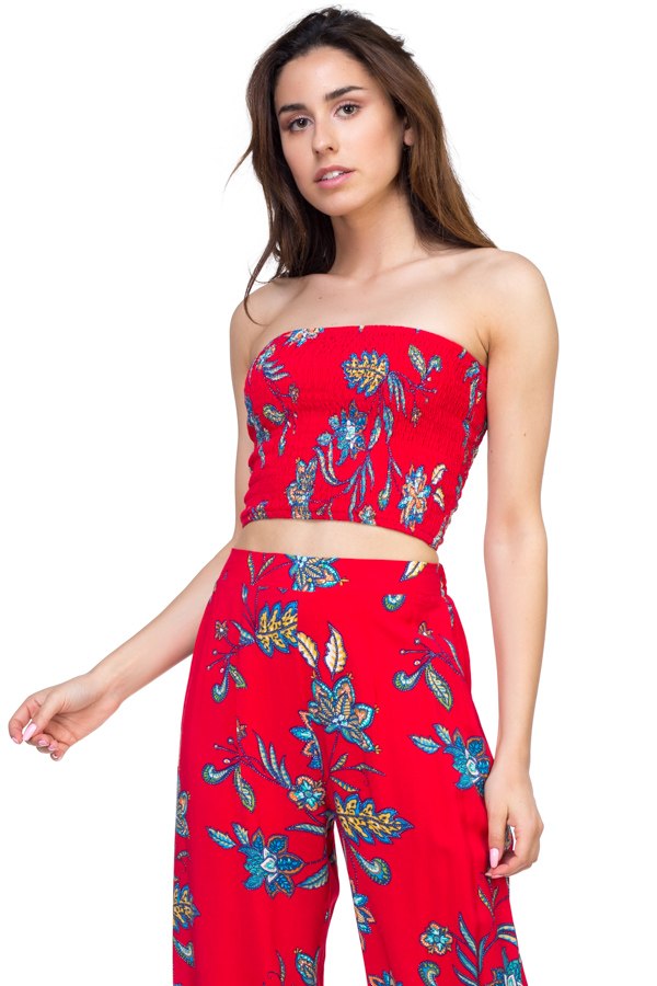 A woven smocked tube top, featuring an allover floral paisley print design, sleeveless, and a cropped hem.