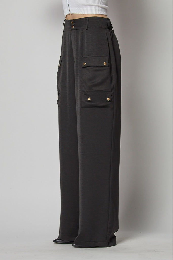 Washed Satin Woven Fabric. 4 Side cargo pockets. Wide leg Pants
