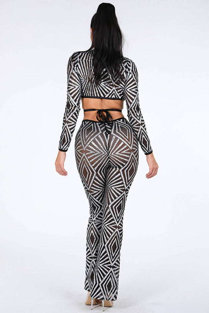 Glitter sequin sheer long sleeve crop top & wide leg pants set.