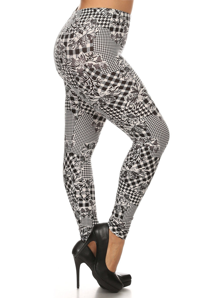 Floral with hounds tooth printed knit legging with elastic waistband, and high waist fit