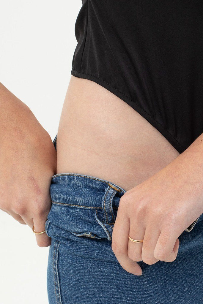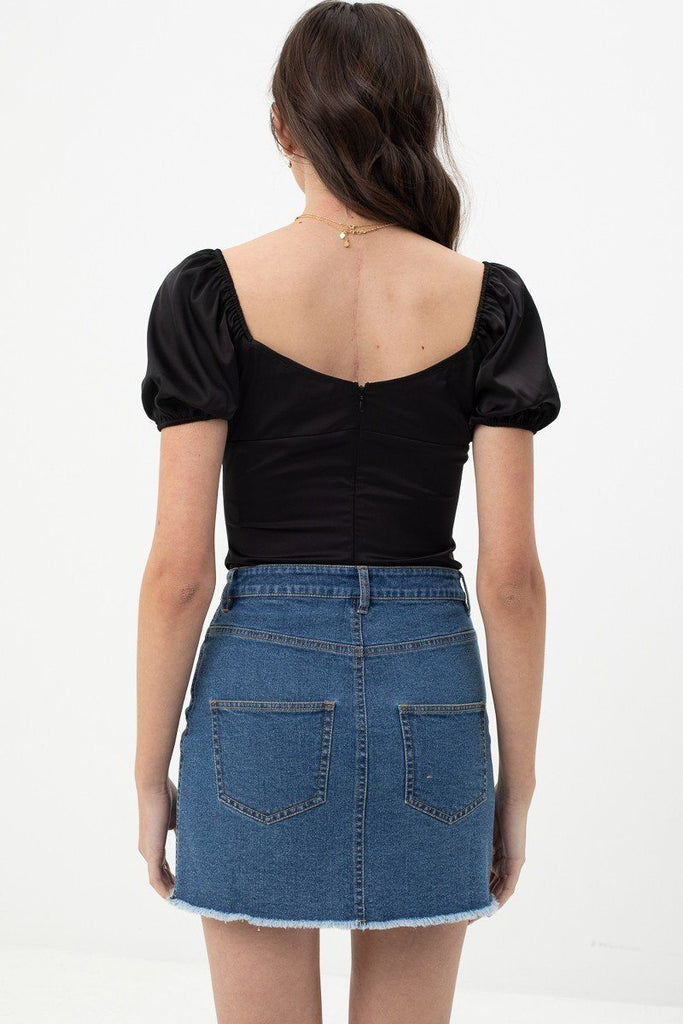 Satin bodysuit with front neck tie and scooped neck. Short sleeve style made from a poly/span fabric blend
