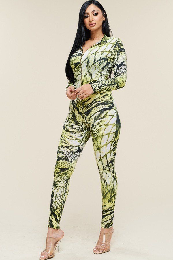 Multi Color Print Long Sleeve Zipper Front Jumpsuit