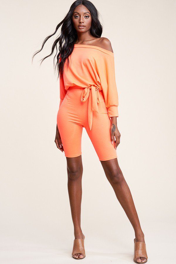 Slouchy solid french terry 3/4 sleeve romper with tie waist
