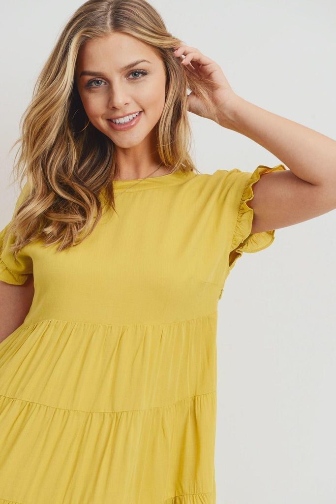 Round neckline Ruffled short sleeve Can can detail Open back with tie Soft woven fabric