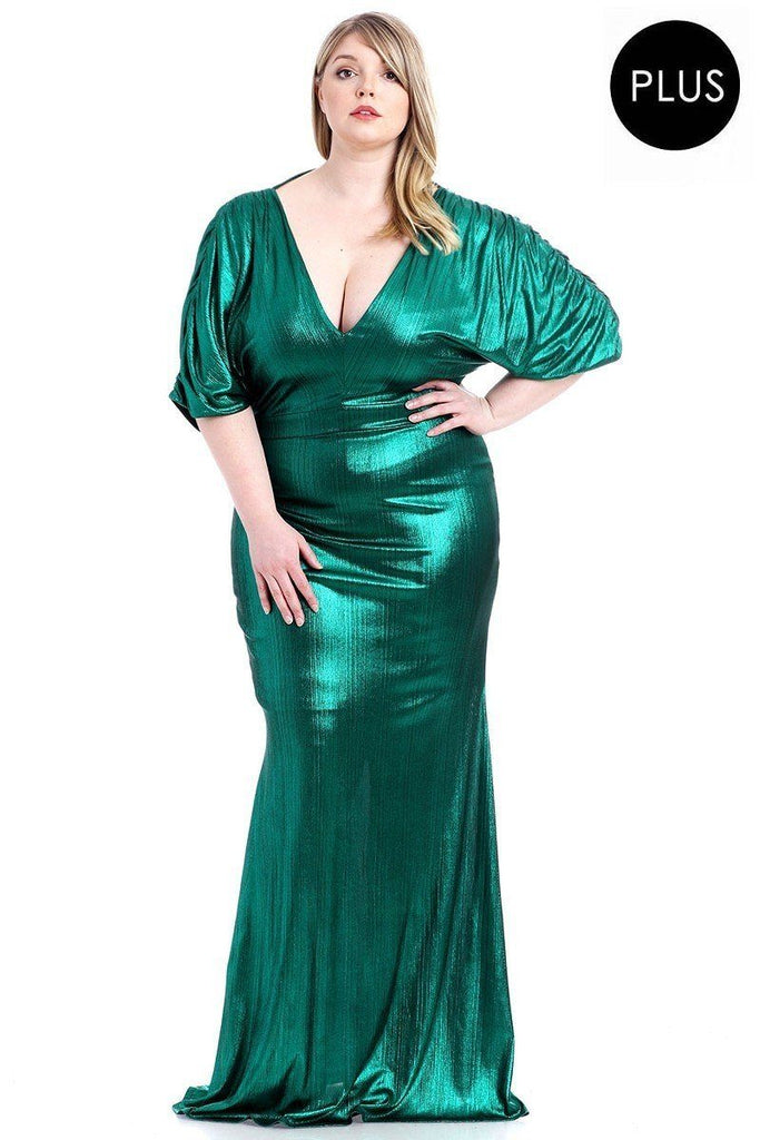 METALLIC RIBBED / DEEP V-NECKLINE / SHIRRING SHOULDER / DROP SLEEVE / TIE BACK NECK DETAIL / LINING INSIDE / PLUS SIZE / MAXI DRESS /