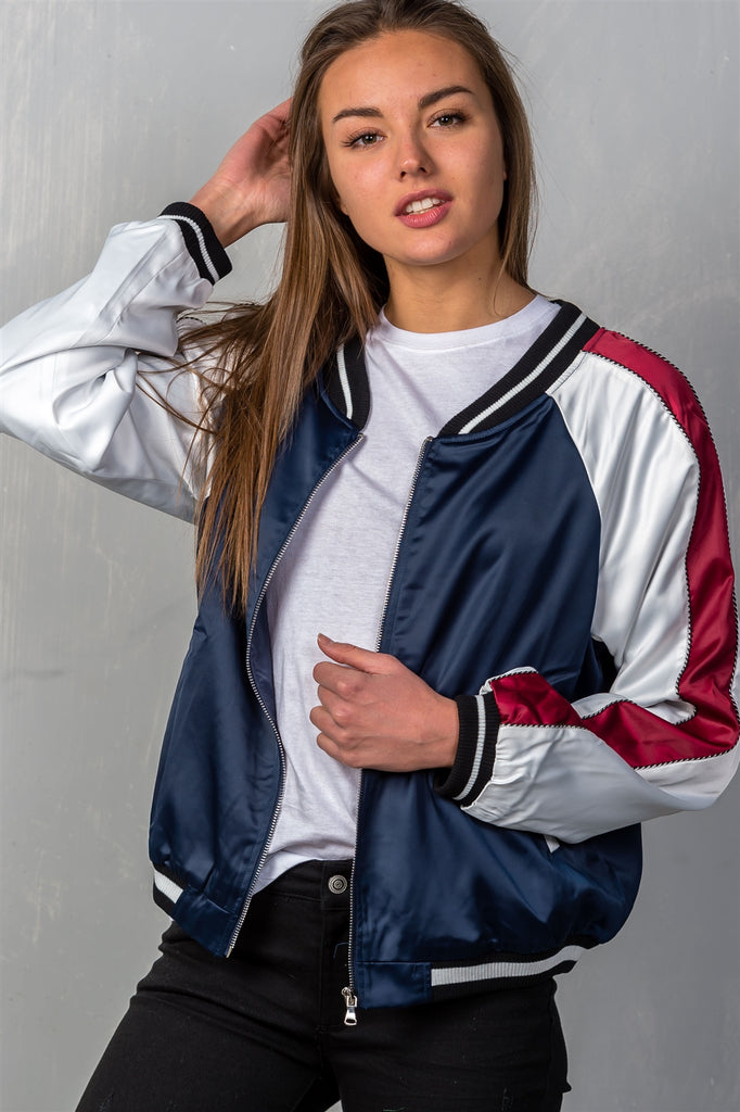 Ladies fashion navy "brunch" embroidered bomber colorblock jacket