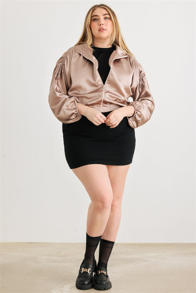 Plus Satin Zip-up Ruched Long Sleeve Cropped Bomber Jacket