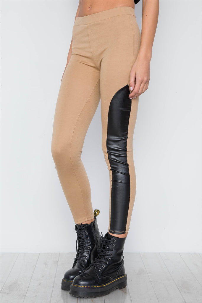 skinny leg, faux leather detail on sides, elasticized waist, Mid-Rise, unlined
