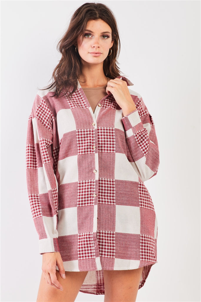 Red & natural, multi plaid print, cotton, oversized, front button down, long sleeve with buttoned cuffs, classic collar, mini length, side pockets, convertible: can be an oversized long shirt, double layered, non-stretch, 90's inspired, casual, comfy, breathable