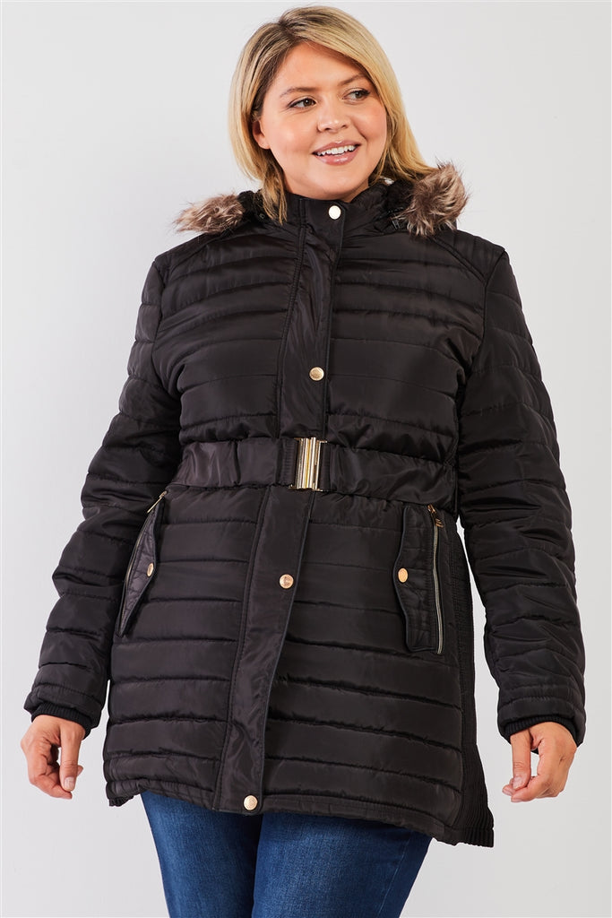 Plus Parallel Quilt Faux Fur Hood Belted Padded Long Puffer Jacket
