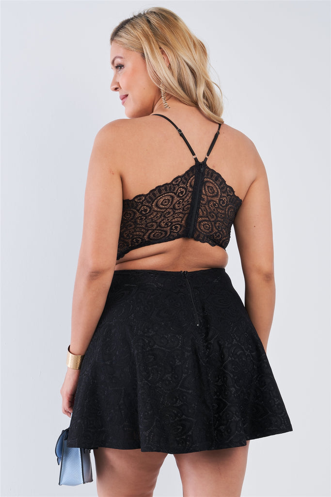 Plus Size V-neck Floral Lace Raceback Flare Skirt Mini Dress