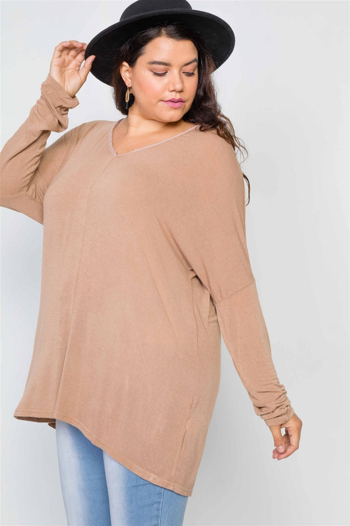 long sleeves, V-neck, raw hem at collar, dropped shoulders, solid, relaxed fit, stretchy