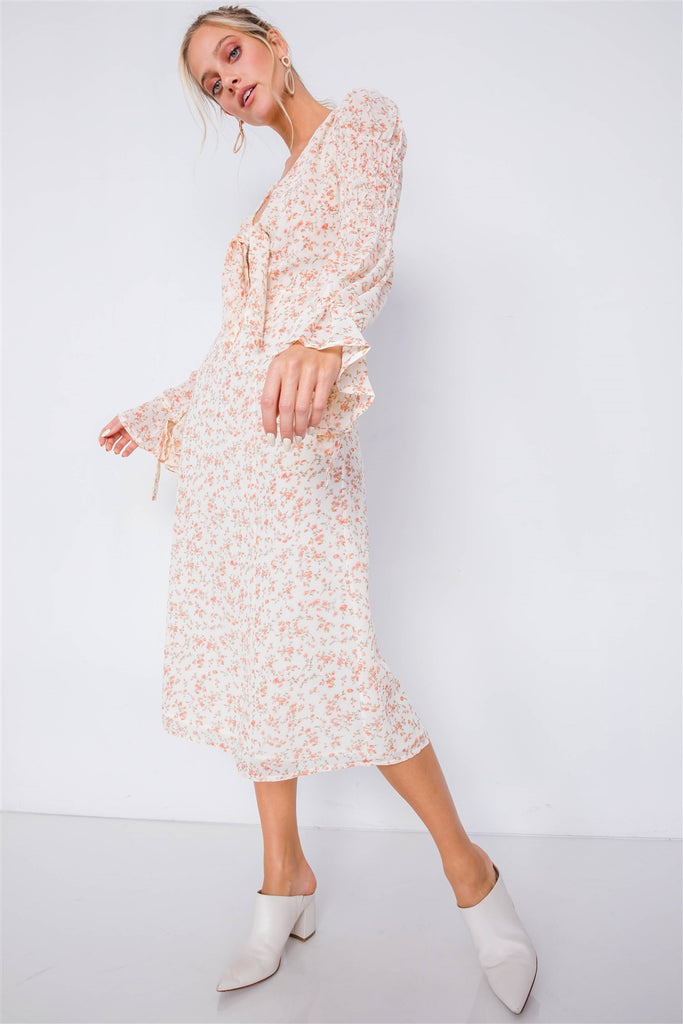 Minimalist Floral Tiered Cinched Puff Sleeve Midi Dress
