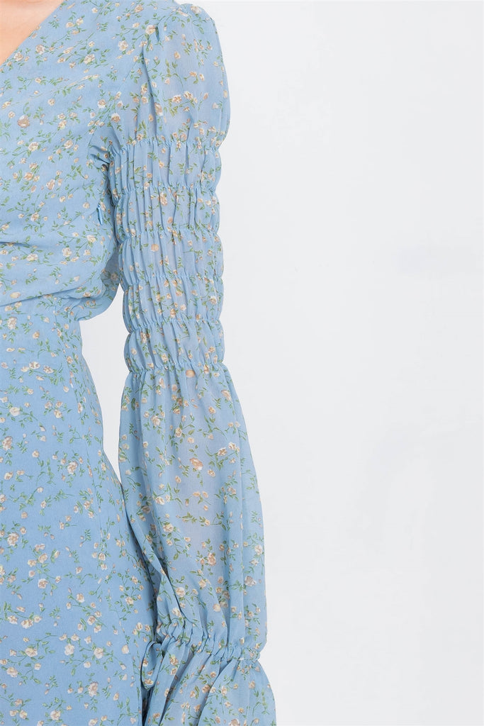 Minimalist Floral Tiered Cinched Puff Sleeve Midi Dress
