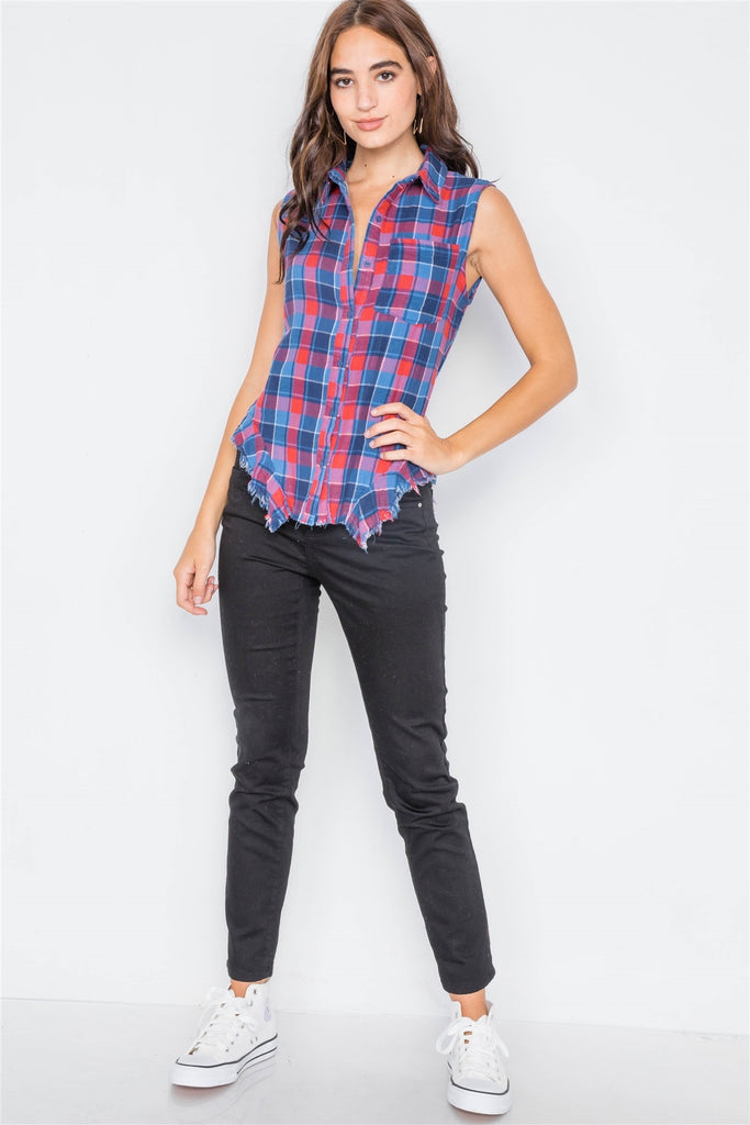 Navy & Red Plaid Stripe Raw Distressed Hem Flannel