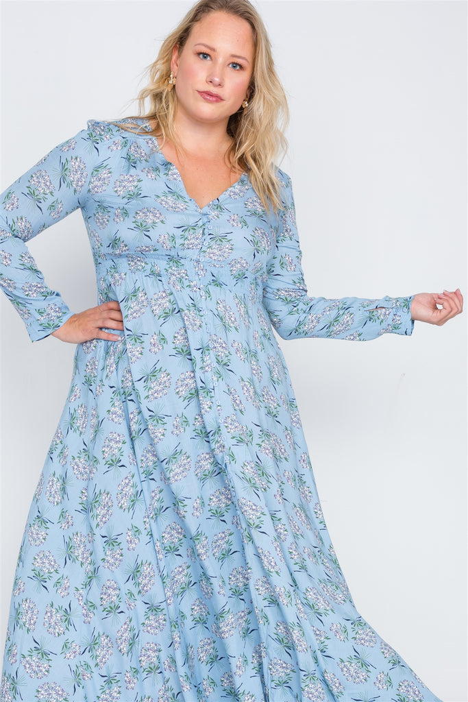 long sleeves with button cuff closure, V-Neck, Button down closure, smocked waist, maxi length, unlined