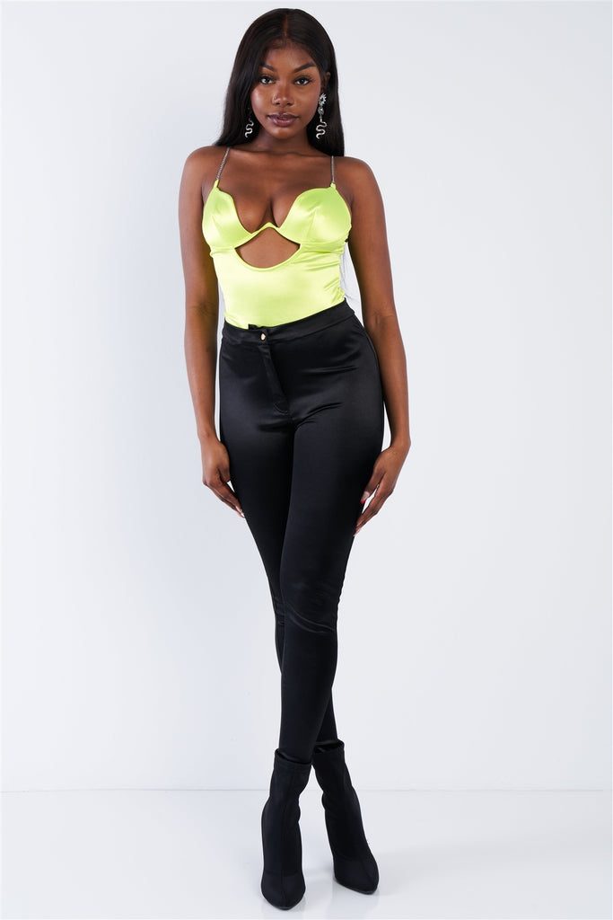 sheen silk, neon yellow, spaghetti strap, silver chain hardware detail, underwire, center keyhole cut out, slight stretch, unlined, bodysuit