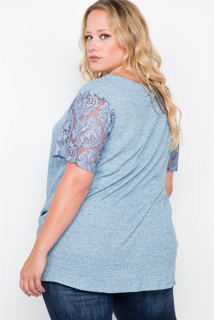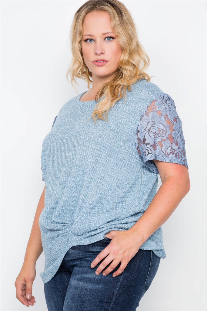 short floral lace sleeves, scoop neck, front side twist detailing, stretchy