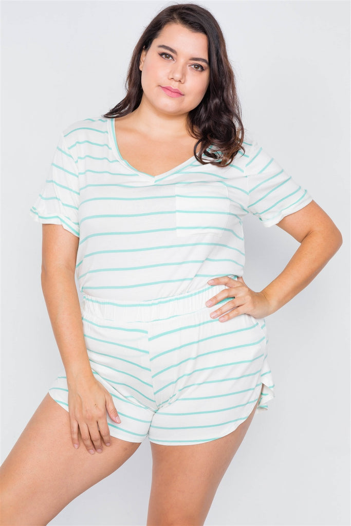 Plus Size Rolled Short Sleeve Stripe Comfy Short Set