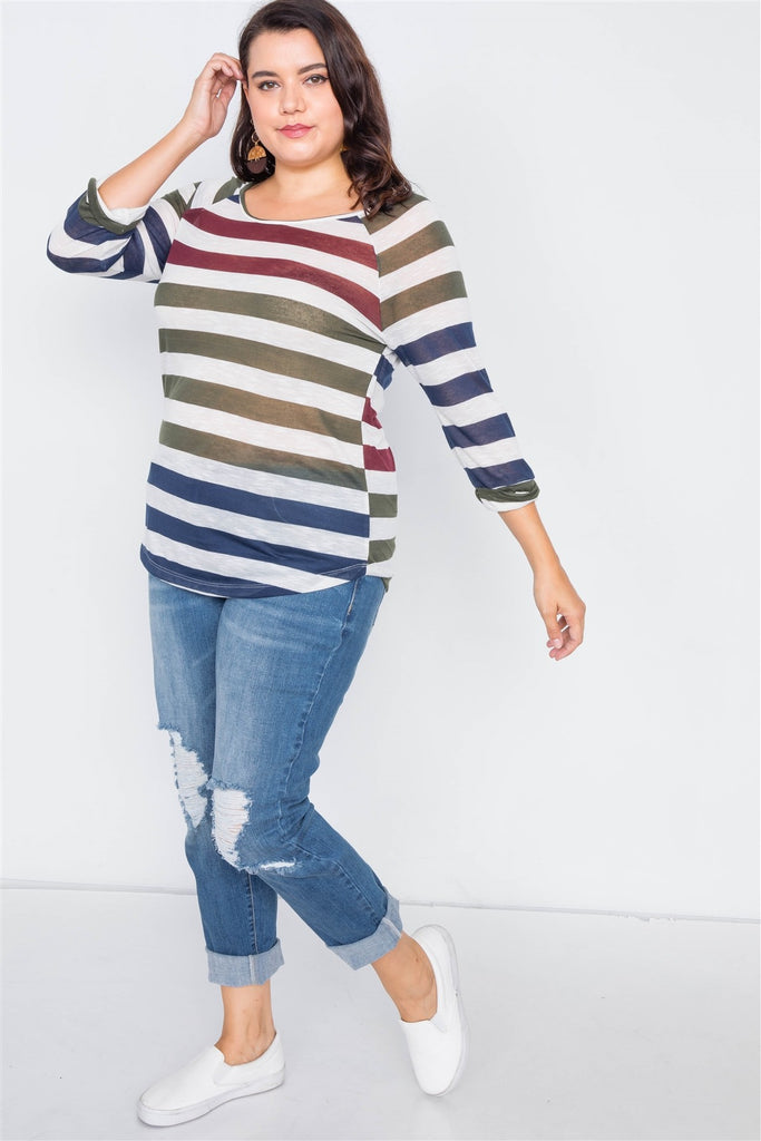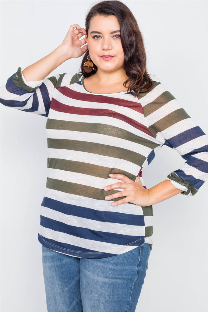 Plus Size Sheer Stripe Round Neck Top
