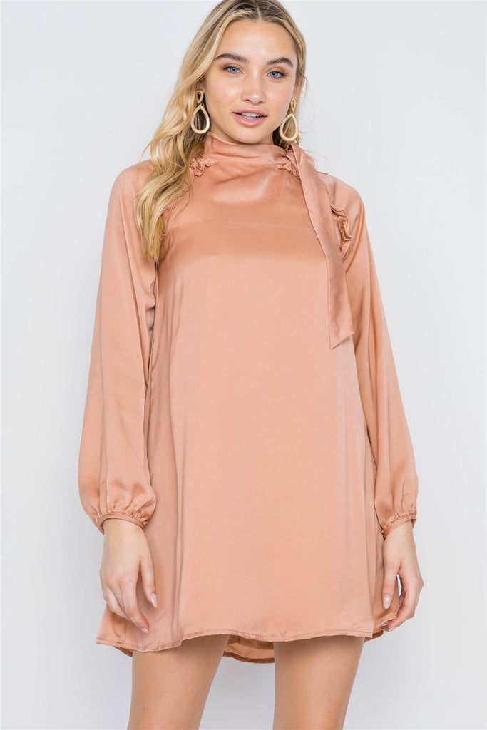 long sleeves, self tie mock-neck, shirred detailing around armholes, relaxed fit, lined