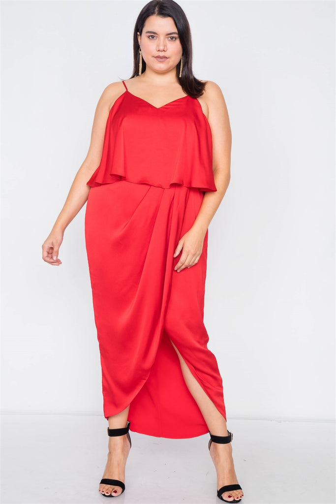 midi length, flounce, v-neck, lined, stretchy, hidden back zipper and clasp closure, adjustable cami straps, full slit, satin, cocktail dress, classy, chic, lined.