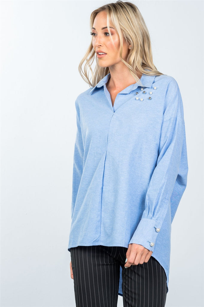 one side faux pearl detailing, loose fit, hi-low hem, pullover.
