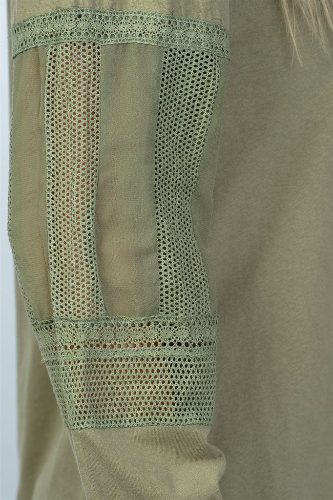 Top features: long sleeves with elastic cuffs, lace trim fishnet sleeves,
