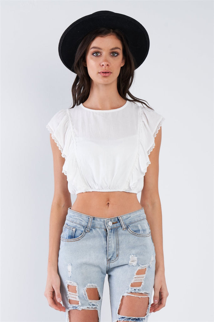 Off-white Semi-sheer Lace Frill Trim Cinched Elastic Waist Crop Top