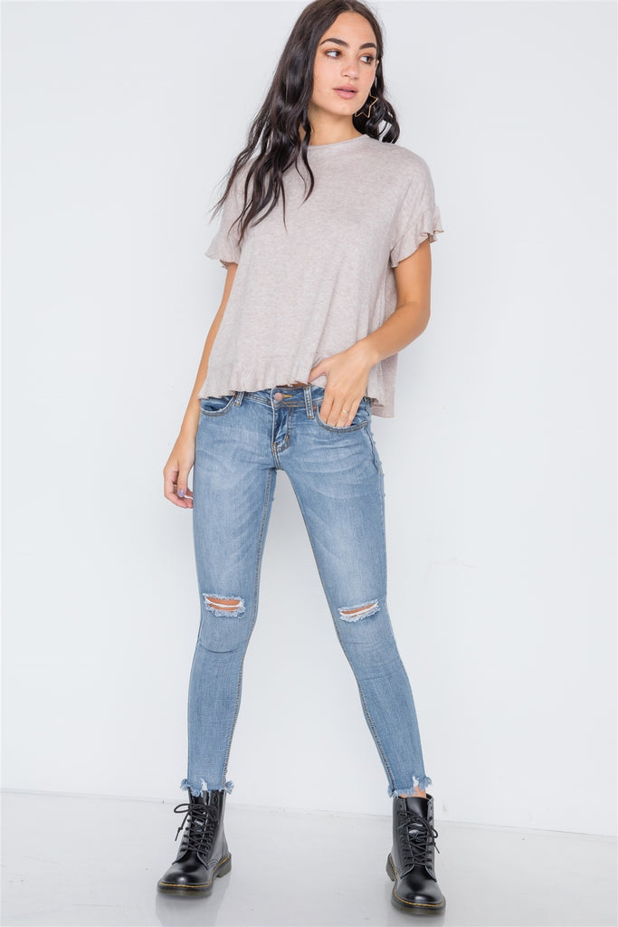 short ruffle sleeves, surplice back, ruffle hem, solid, round neck, dropped shoulders